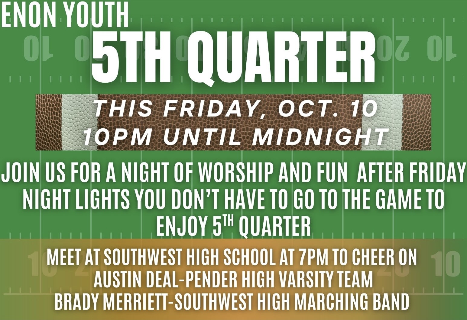 We'd love for your teenager to join us at the football game before 5th Quarter! Tickets for the game range from $7-$10. Contact Kelsey Gladden at (910) 585-1378 for more info or questions!